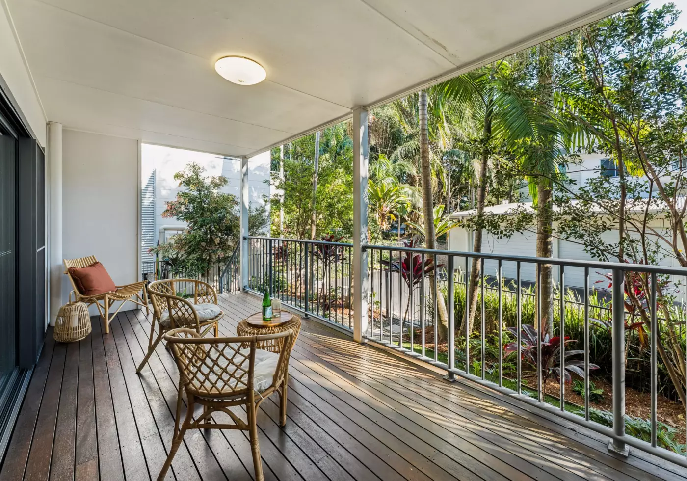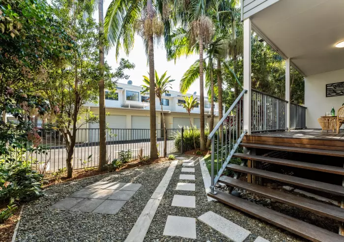 'Beachbreak' complex is a sought-after, architecturally designed enclave in the beachside village of Suffolk Park. Unit 30 is an airy, open-plan ground-floor apartment with a northerly aspect that includes a generous undercover deck and overlooks sun-dappled tropical gardens.