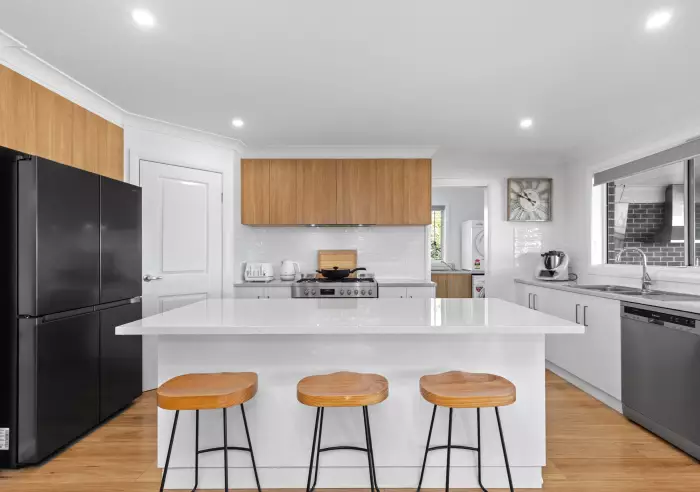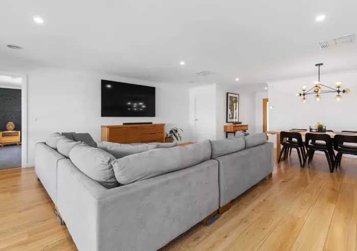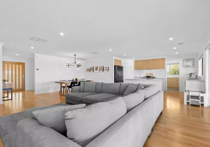 Step inside and be instantly impressed by the light-filled interiors, open-plan design, and neutral tones that create a welcoming atmosphere from the moment you arrive. At the heart of the home lies a well-appointed kitchen featuring stainless steel appliances, ample storage, and a large island bench overlooking the spacious dining and living area – ideal for entertaining or relaxed family living.