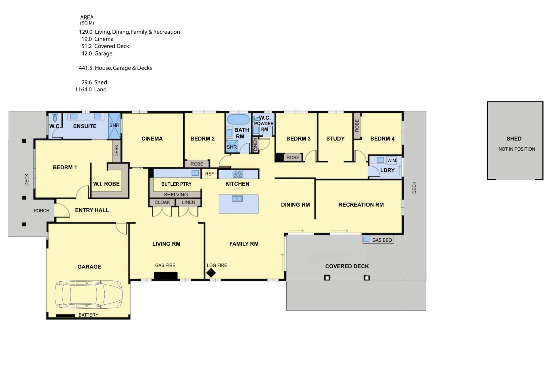 Although gas heating and refrigerated air conditioning is ducted throughout, blade style ceiling fans are also fitted to Family/Dining areas, all Bedrooms, Study and the Covered Deck.