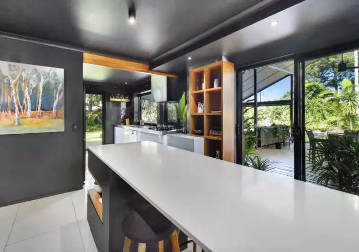 Including a breathtaking master suite on the ground floor featuring soaring ceilings, a private tropical garden outlook, designer ensuite and expansive custom walk-in robe. Four additional freshly painted and carpeted bedrooms with built-ins occupy the upper level.