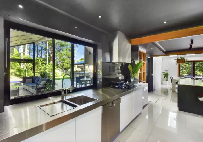 A chef’s delight boasting stainless and stone benchtops, gas cooktop and electric oven, dishwasher, walk-in pantry and a servery window to the incredible poolside alfresco entertaining area — complete with inbuilt Weber BBQ and drinks fridge.