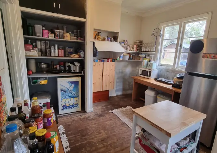 Selling in as is condition, this home has original timber floorboards, window frames, sconcing and a fireplace.