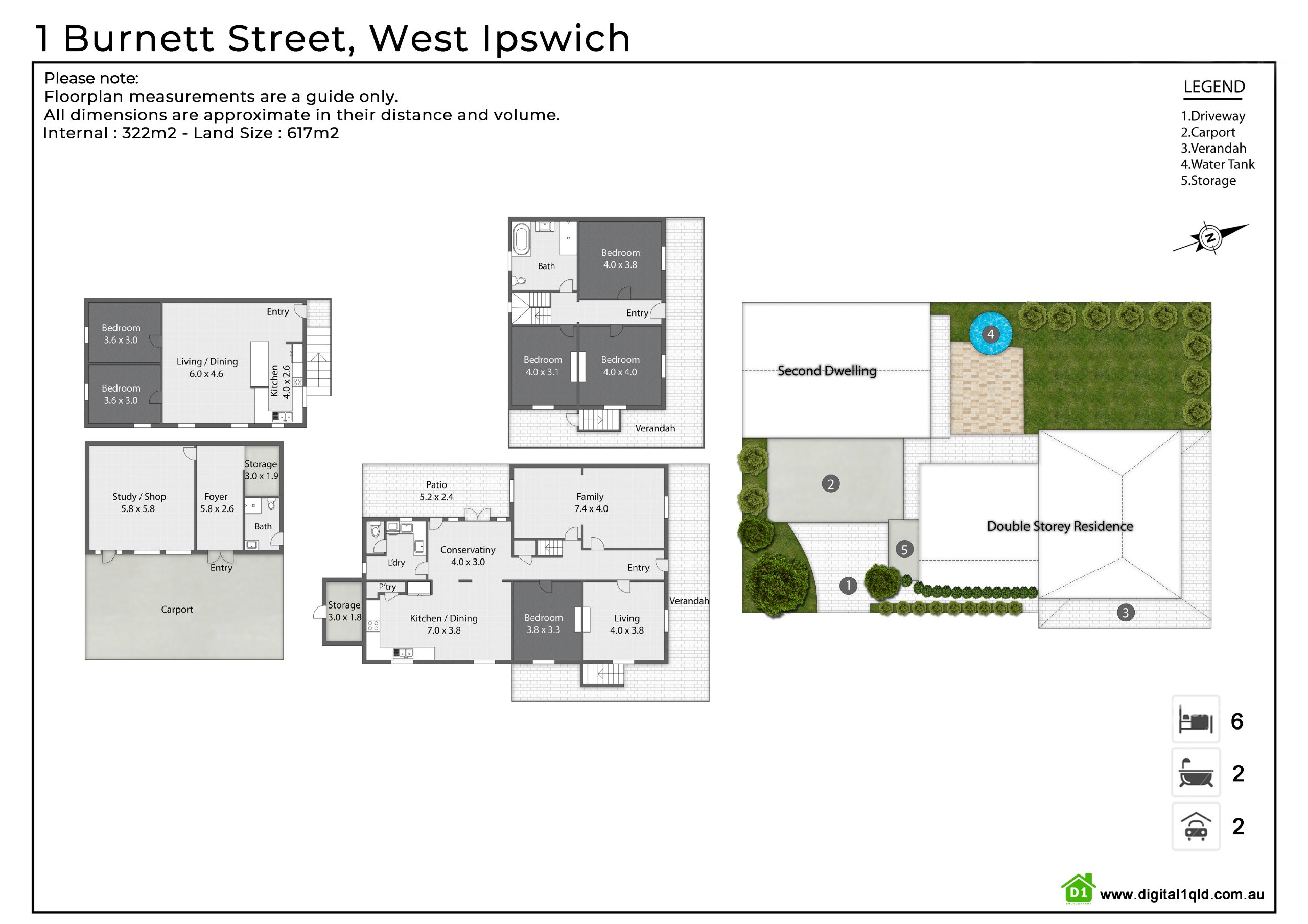 • Main residence has 5 Brdrooms, 3m ceilings, bathrooms + powder room.