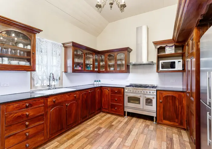 • Large kitchen/dining with stone benchtops, stainless steel appliances including ILVE freestanding stove, antique porcelain double-bowl sink, concealed dishwasher, and compact walk-in pantry.