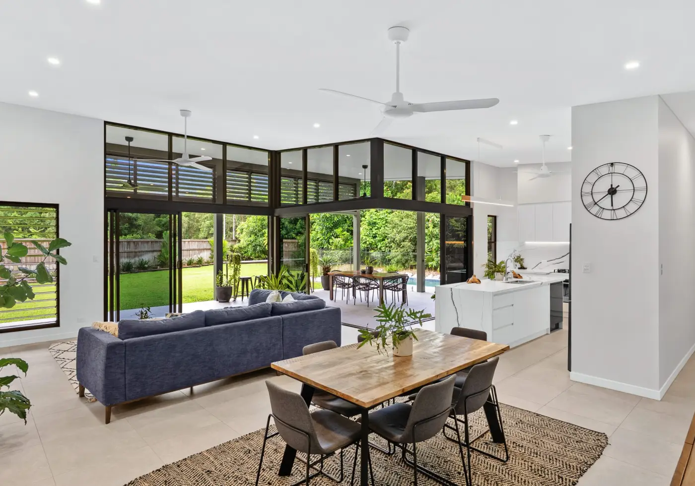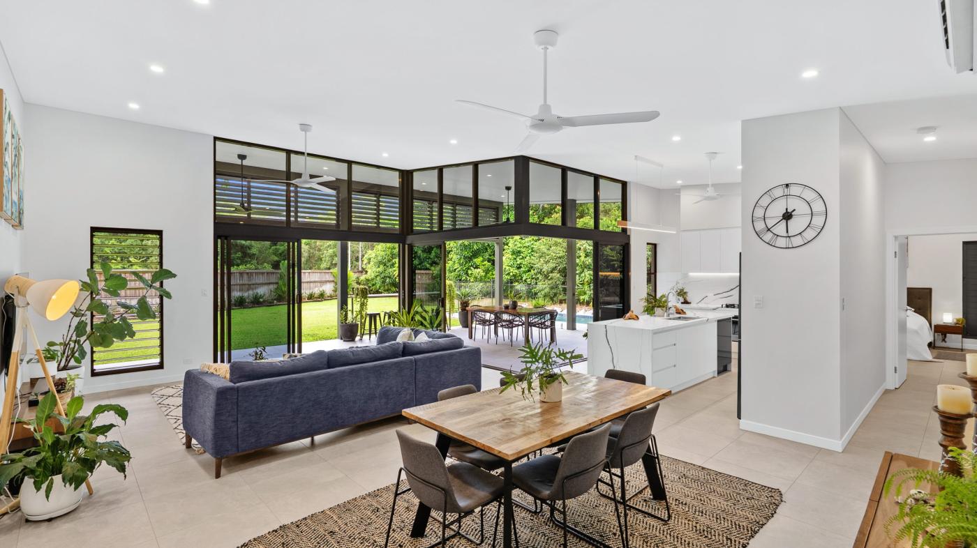 At the heart of the home, open plan living delivers both scale and functionality. High ceilings and expansive stacking glass doors flood the space with natural light while capturing cross ventilation, creating a breezy, welcoming environment year-round. It’s a space designed equally for relaxed family living and effortless entertaining.