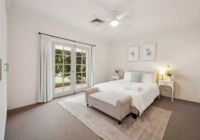 Set on a generous 737m², the home offers five king size bedrooms with built in robes and a private master suite with walk-through robe and ensuite, two separate living zones, and a centrally positioned kitchen with stone benchtops and views to the garden and pool. French doors and floor-to-ceiling windows draw in northern light, creating a calm and airy atmosphere throughout the main living areas.